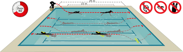Pour la première longueur : un départ du bord du bassin ou d’un plot de départ, suivi de 25 mètres nage libre en surface